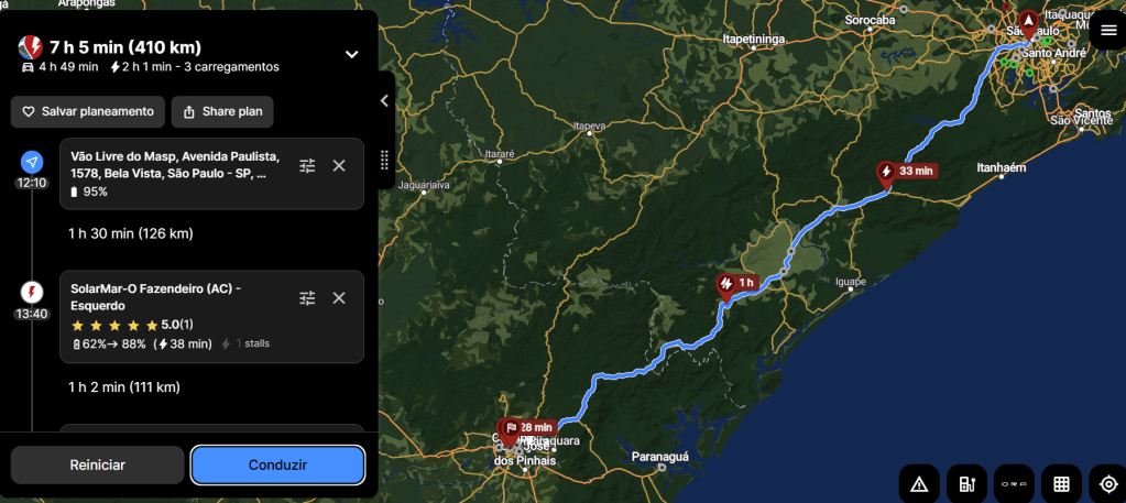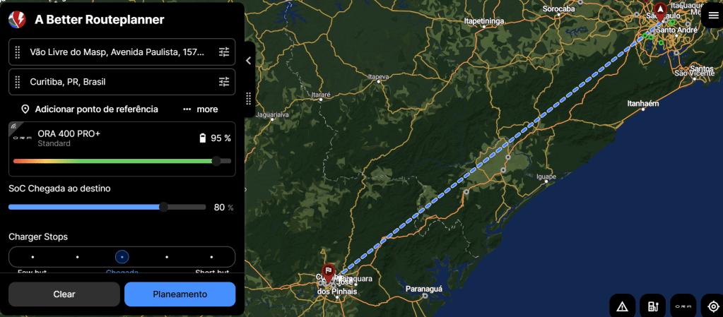 Com o carro já configurado, você poderá planejar suas viagens, como neste exemplo feio pelo site, simulando uma viagem que sai do vão do MASP em São Paulo, com destino a Curitiba.
