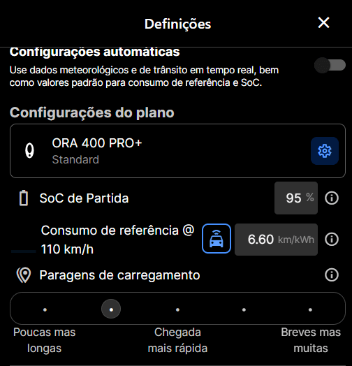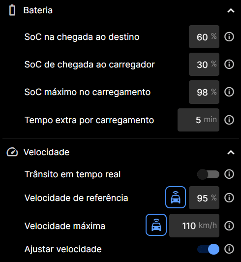 • SoC de partida – ou seja, qual percentual de bateria no momento da partida e aqui vale um “truque” coloque sempre 5% a menos do que você vai sair realmente e assim ganhe 5% extra para qualquer eventualidade.