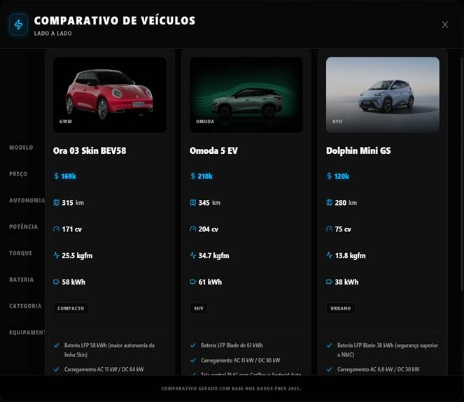 No Guia PBEV, você seleciona até 3 veículos e compara: preço, autonomia INMETRO/PBEV, potência, torque, bateria, categoria e a lista completa de equipamentos — ADAS, airbags, câmeras, conectividade, carregamento AC/DC.