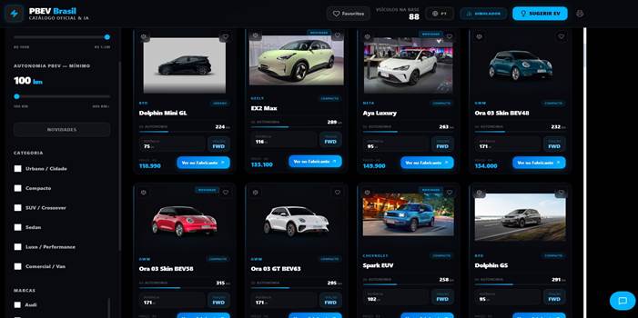 Catálogo com 88 modelos BEV: filtros por preço (até R$ 1.5M), autonomia PBEV (100-600+ km) e categoria, usando dados oficiais do INMETRO.