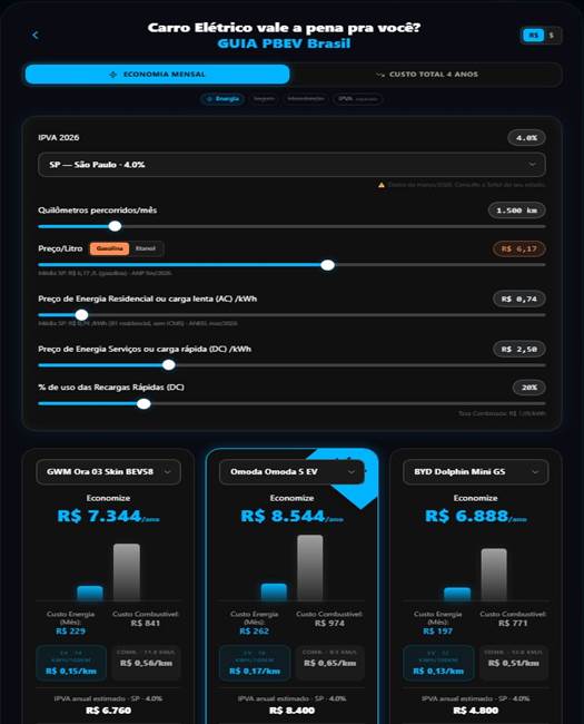 Esta é a funcionalidade que mais gera reação. O Simulador TCO (Custo Total de Propriedade) compara, ano a ano, quanto custa ter um carro elétrico versus um equivalente a combustão na mesma categoria.