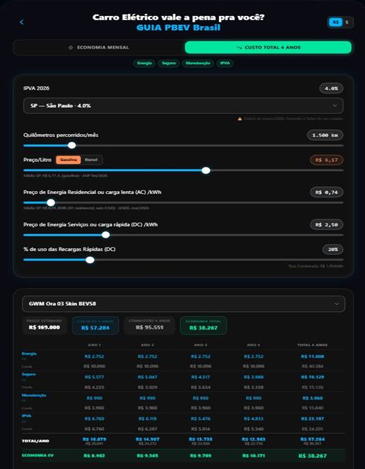 O simulador também calcula o custo total em 4 anos, incluindo depreciação (9,5% a.a. para EV vs. 7% para combustão), seguro proporcional ao valor depreciado e manutenção acumulada.