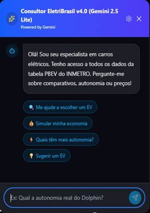 A plataforma tem um assistente virtual especializado — o Consultor EletriBrasil v4.0, alimentado por IA (Google Gemini 2.5 Flash Lite). Ele tem acesso a todos os dados da tabela PBEV e oferece atalhos como “Me ajude a escolher um EV”, “Simular minha economia” e “Sugerir um EV” — tudo contextualizado para o mercado brasileiro.