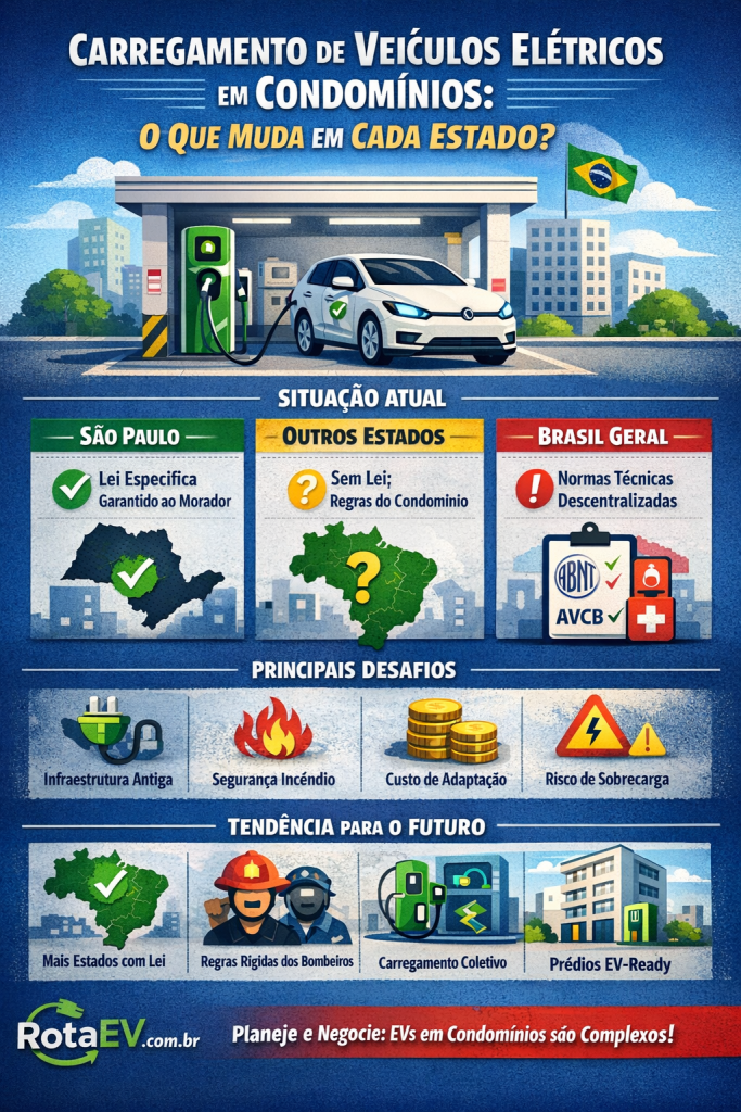- Não existe uma lei federal específica sobre carregamento em condomínios